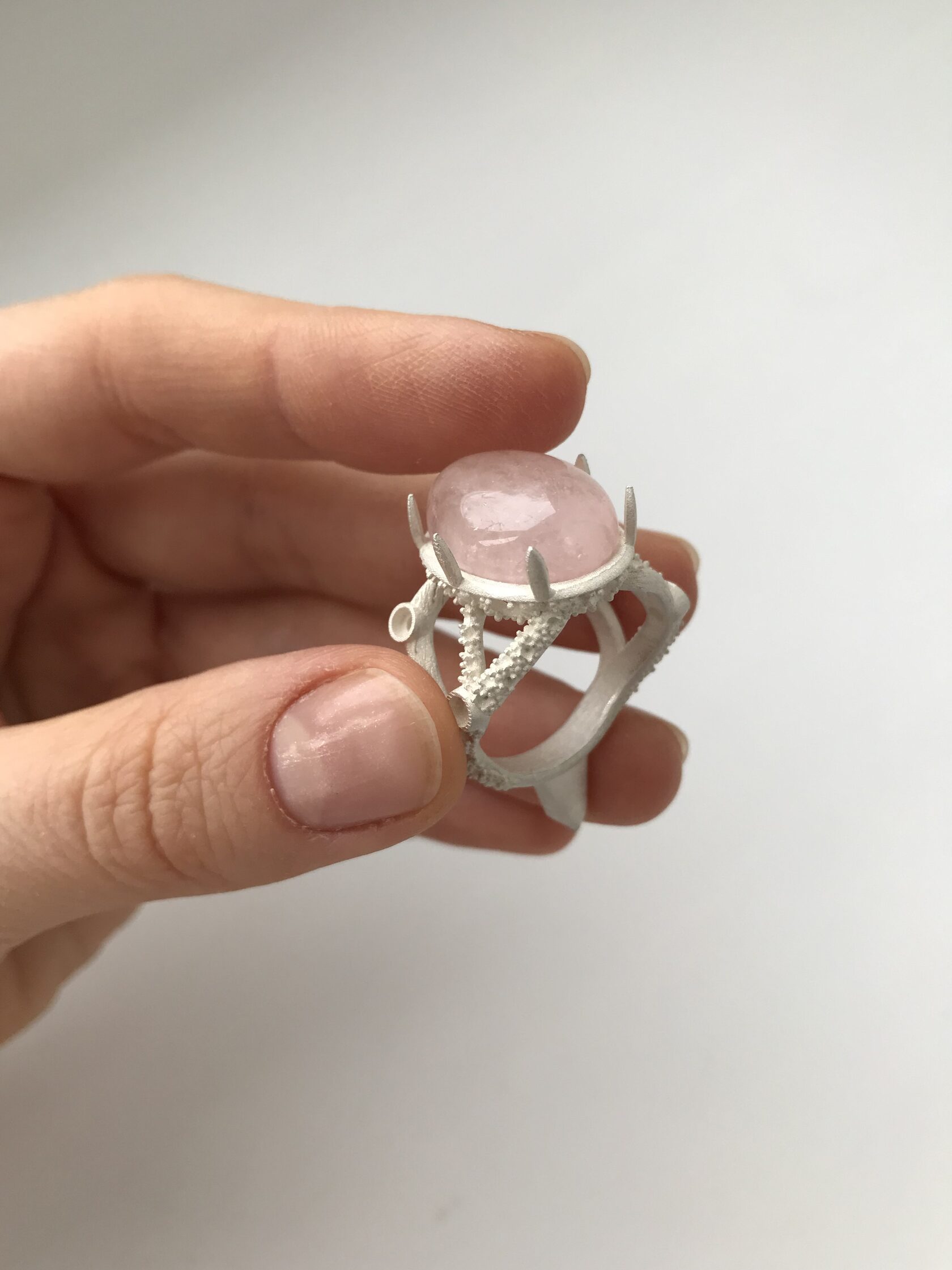 «Веточки» кольца в этой версии наполовину инкрустированы камнями, а между ними пространство заполняют серебрянные шарики.