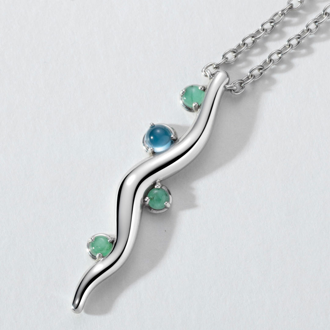 Колье в форме волны, украшено голубыми топазами и зелеными бериллами.